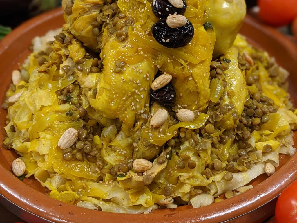 sel, sucre, levure de boulanger, huile, semoule, eau, oignon, huile, persil, ail, curcuma, safran, sel, poivre blanc, beurre, poulet, gingembre en poudre, fungrec, lentilles