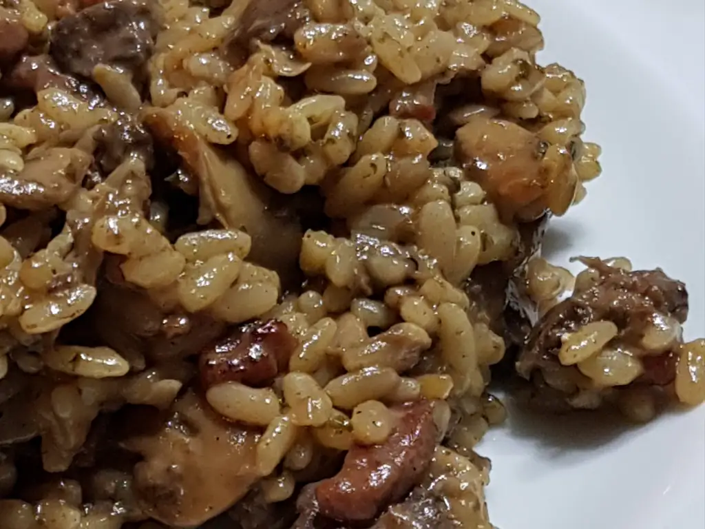 riz pour risotto, vin rouge, bouillon de volaille, champignon de paris, oignon, ail, lardons, huile d'olive, beurre, parmesan râpé, poivre, sel, persil, foie, échalote, crème fraîche liquide