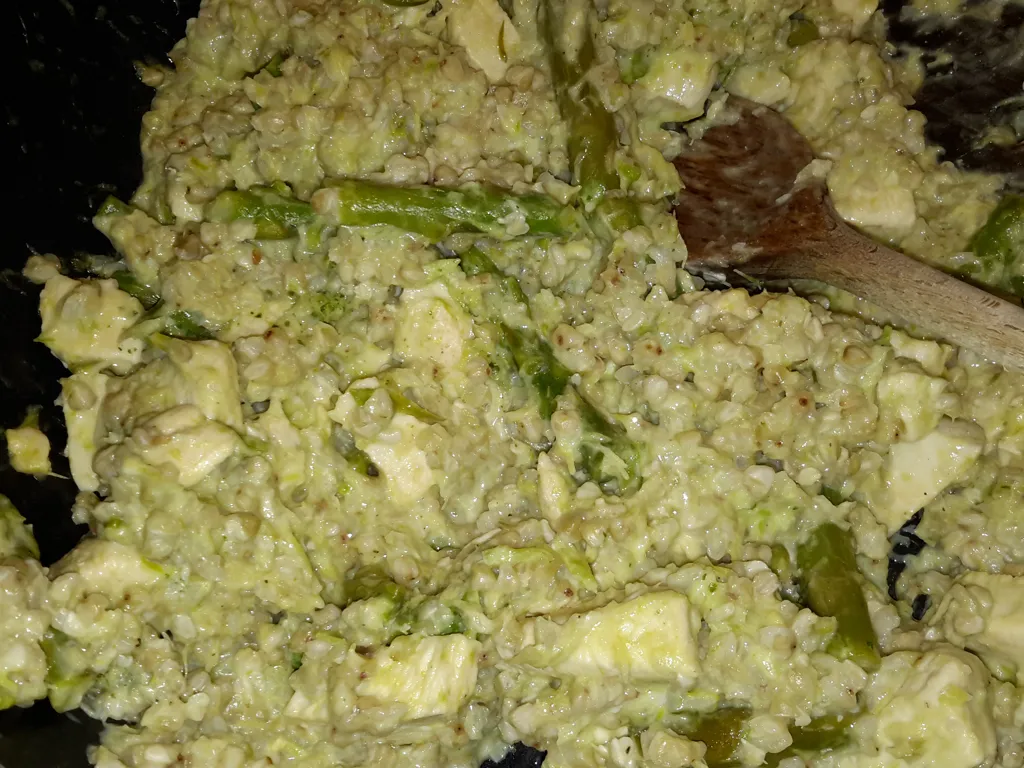 pendant ce temps, faire cuire 250 g de riz pour risotto dans de l'eau, verser dans la sauce, ajouter du persil frais ou surgelé et s'il le faut, allonger la sauce avec un yaourt nature.