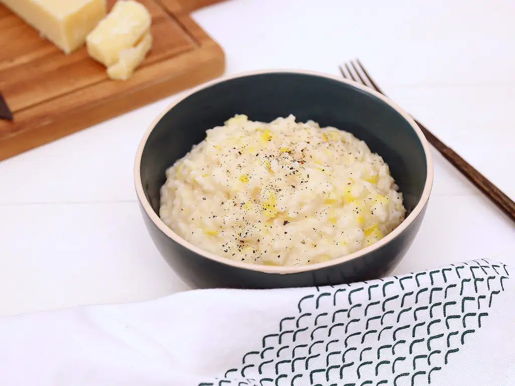 poireau, riz pour risotto, cube de bouillon, vin blanc sec, parmesan râpé, beurre, crème fraîche