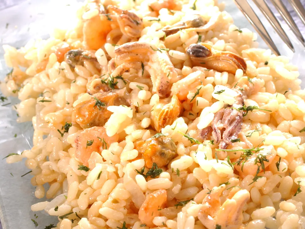 riz, oignon, ail, aneth, crème fraîche, huile d'olive, tomate, vin blanc sec, poivre, sel, fruit de mer, crevettes, échalote, fumet
