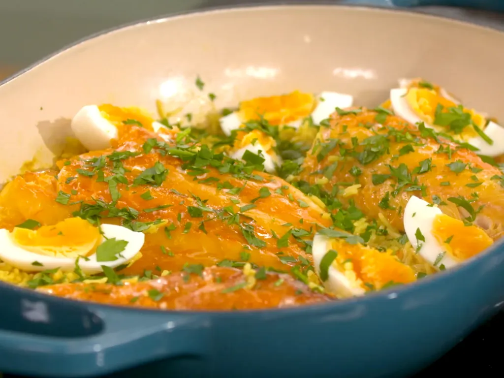 couvrez et laissez cuire 10 minutes à feu doux. otez le couvercle, versez le jus du citron et disposez le haddock sur le riz. poursuivez la cuisson encore 5 minutes. déposez les quartiers d’œufs sur le riz et saupoudrez de persil concassé. servez.