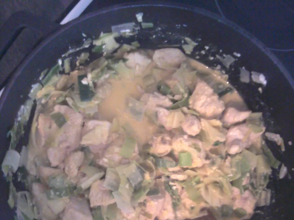 faire revenir les dés de poulet dans le beurre, ajouter les poireaux et laisser cuire en mélangeant constamment.