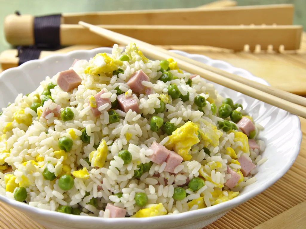 champignon de paris, oignon, riz thaï, jambon, oeuf, crevettes, porc, boeuf, ciboulette, sauce soja