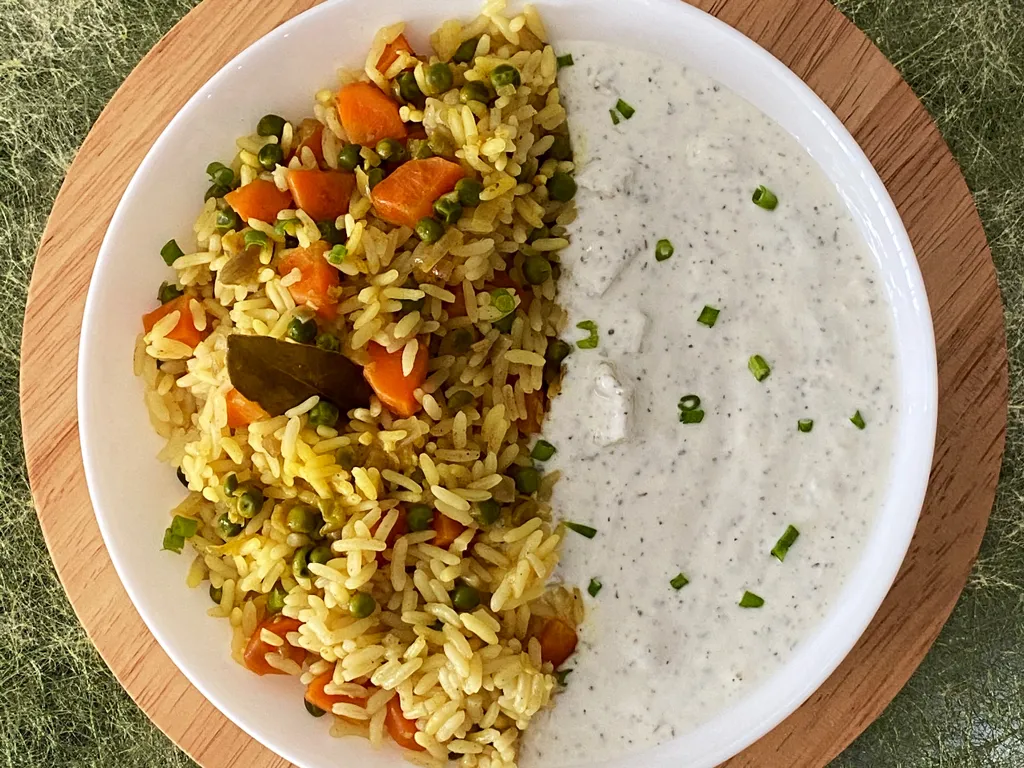 yaourt, ail, sel, concombre, menthe, riz basmati, carotte, ail, gros sel, cannelle, gingembre, paprika, curcuma, curry, feuille de laurier, petits pois, oignon rouge, huile végétale