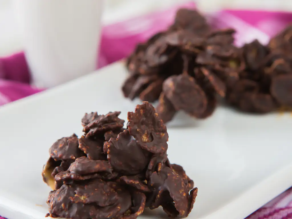 former de petits rochers (à l’aide de 2 cuillères) et les poser sur une plaque recouverte de papier sulfurisé. laisser reposer les roses des sables 10 min avant de servir.