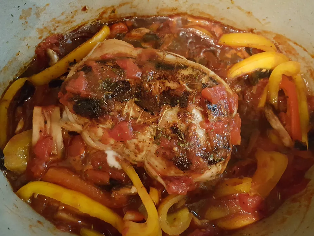 poivron rouge, tomate, bouquet garni, crème fraîche, dinde, oignon blanc