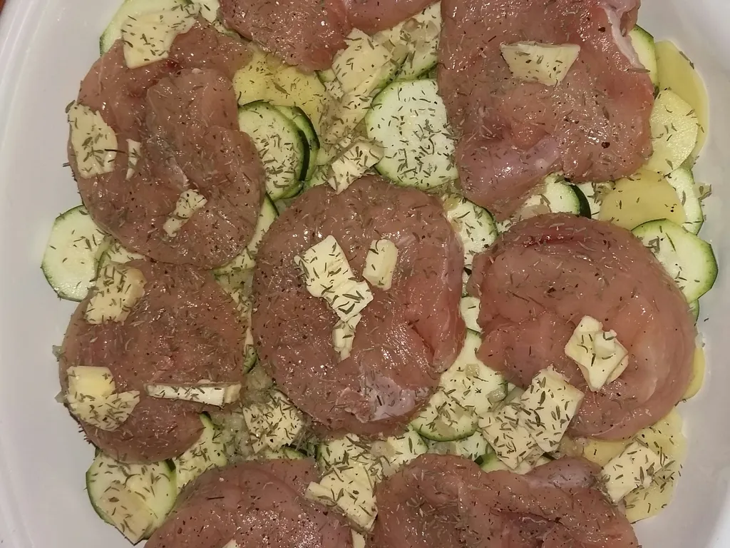 alterner des couches de légumes dans un plat allant au four, déposer sur le dessus les tranches de viande et parsemer de la moitié des dés de beurre.