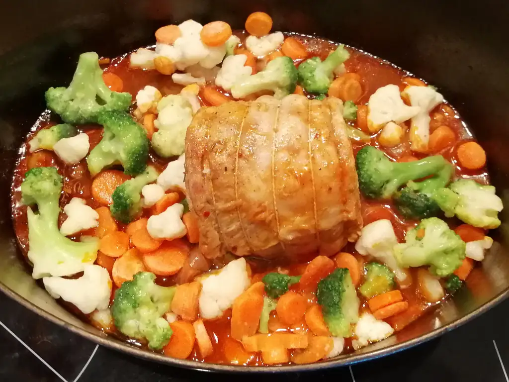 carotte, courgette, tomate, aubergine, poivron rouge, oignon, ail, bouquet garni, vin blanc, étoile de badiane, huile d'olive, poivre, sel, rôti de porc, navet, genièvre, pulpe de tomate