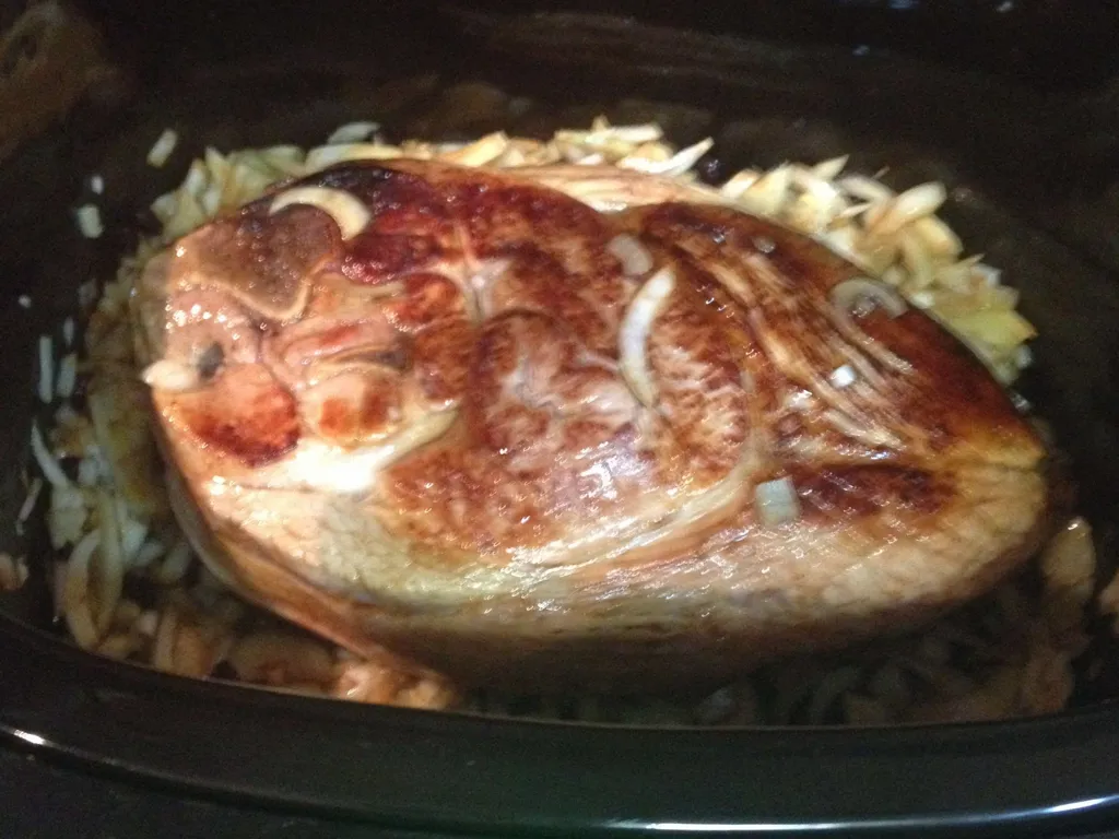 quand la rouelle a pris une belle couleur la couvrir avec de l'eau, le miel et encore 5 cuillères à soupe de sauce soja.