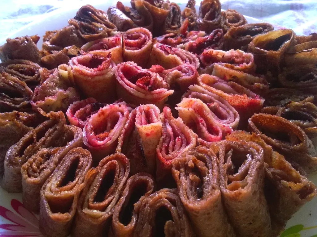 découper chaque crêpe en rouleau de 3 cm de haut environ et ranger les rouleaux sur une assiette.