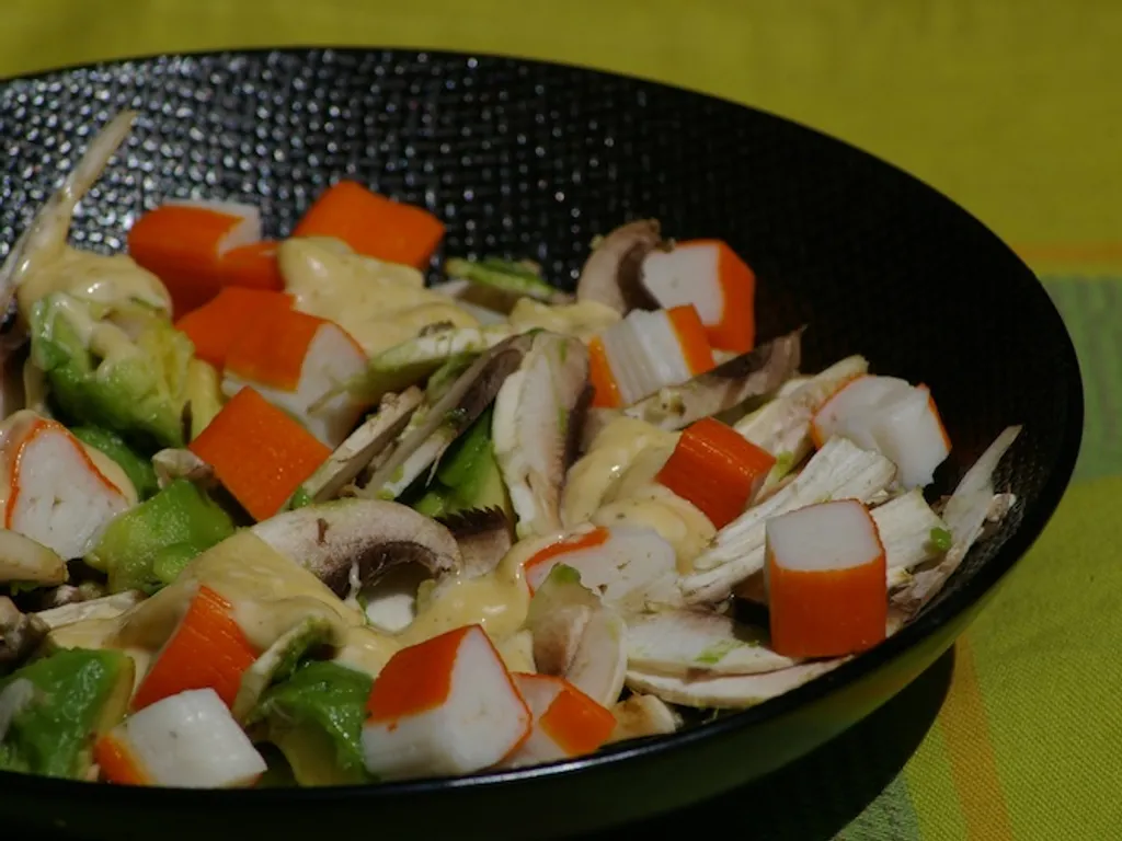 champignon de paris, vinaigre, poivre, sel, avocat, surimi, mayonnaise