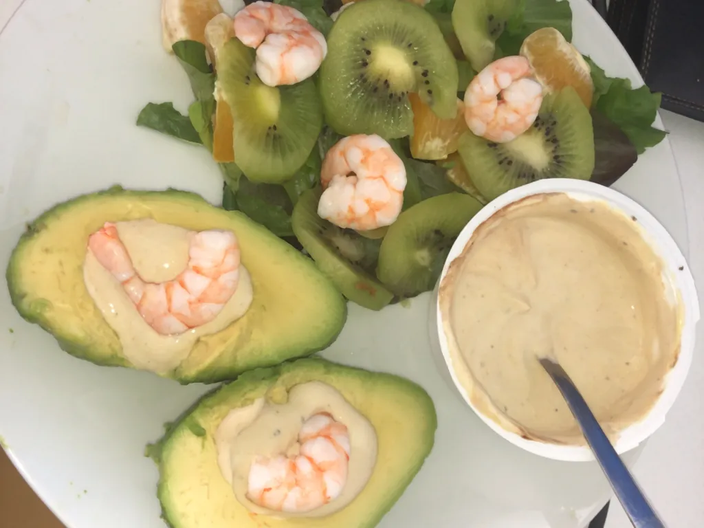 curry, vinaigre balsamique, moutarde, poivre, sel, yaourt à la grecque, orange, avocat, kiwi, crevettes, salade