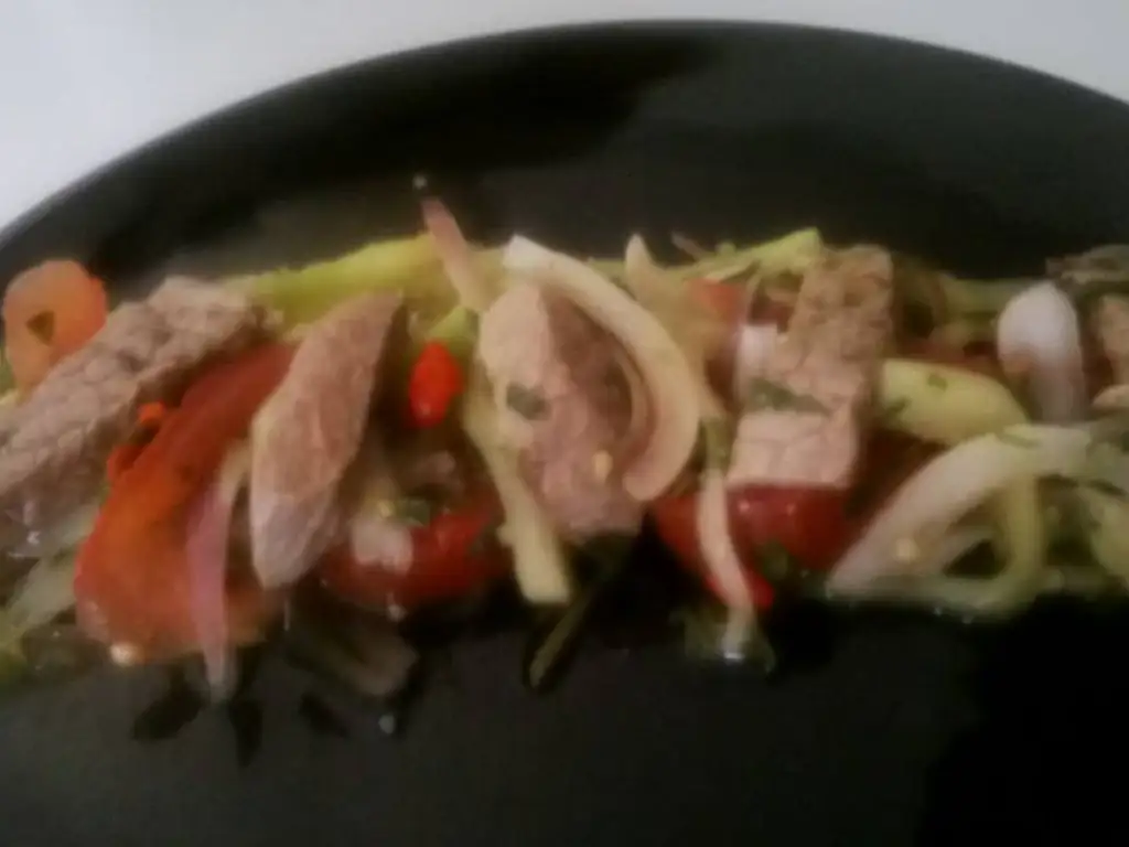 filet de boeuf, oignon, tomate, piment, ail semoule, sucre, feuilles de coriandre, sauce d'huître, huile de tournesol, échalote, concombre, citron vert, ciboulette, menthe, poisson, sauce soja