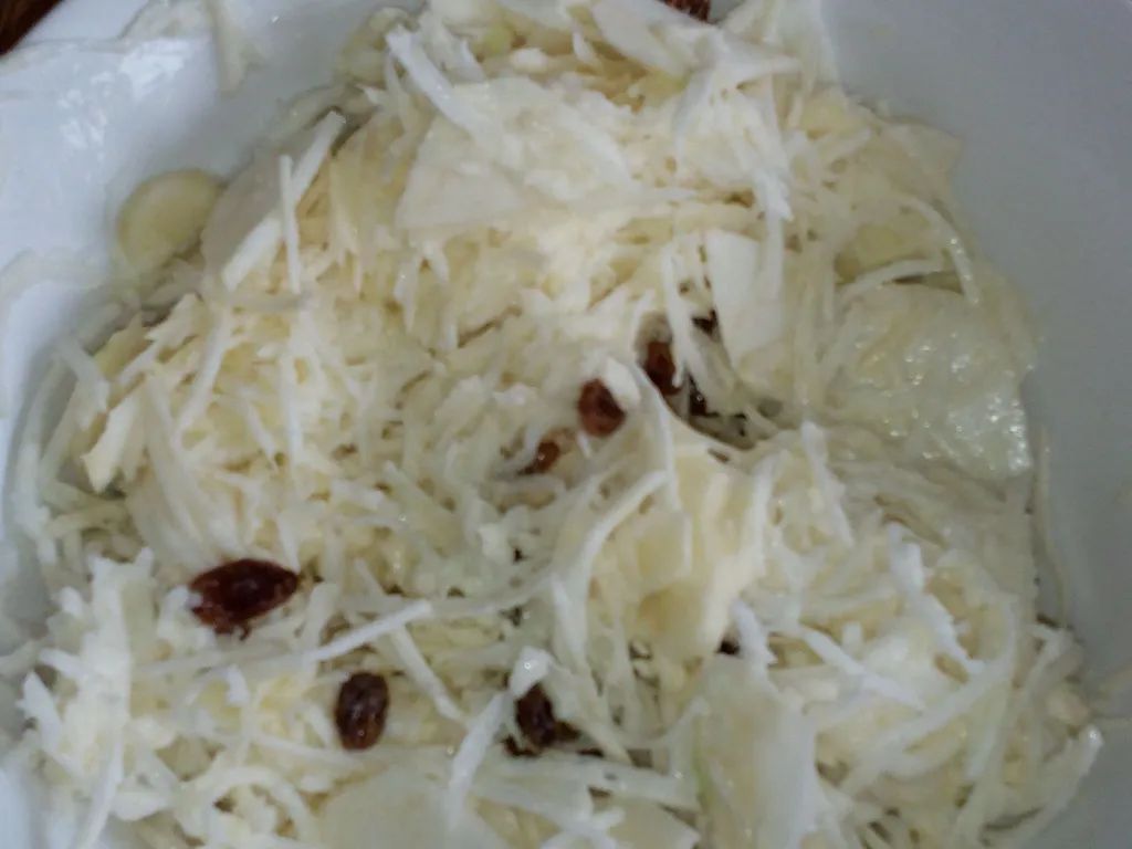 ajouter le fromage blanc, du jus de citron, quelques raisins secs et noix, mélanger le tout...