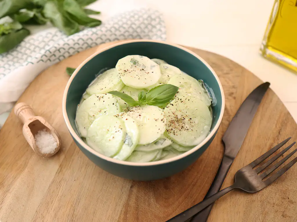 crème fraîche, huile d'olive, basilic, poivre, sel, concombre