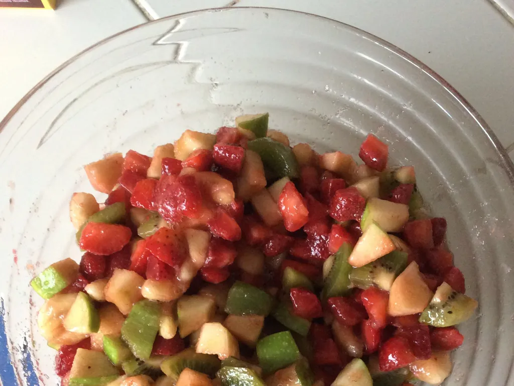 fraises, orange, pomme, banane, eau de fleur d'oranger, sucre roux, kiwi, autres