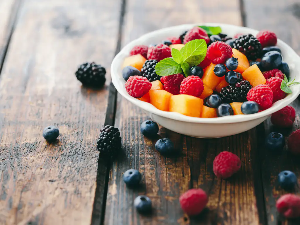 pendant que le sirop cuit, détailler le melon en petits morceaux (ou faire des boules avec une cuillère parisienne si vous êtes équipé!), et les mettre dans un saladier. ajouter les fruits rouges lavés et séchés (couper les fraises en 2 si elles sont trop grosses).