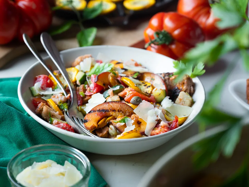 ail, huile d'olive, câpres, fleur de sel, poivre, vinaigre balsamique, échalote, oignon cébette, herbes aromatiques, tomate, parmesan, courgette jaune, coeur d'artichaut, pain, concombre, pêche