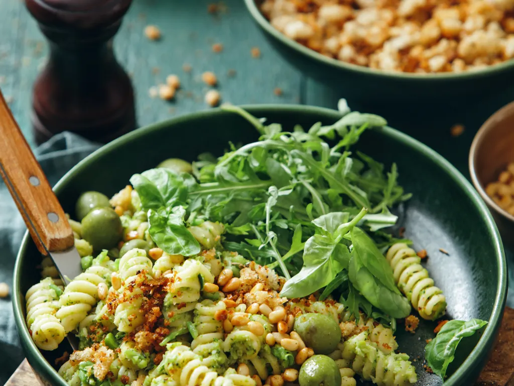 pâtes, pesto, pignons, olives vertes, chapelure