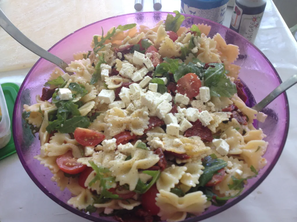 tomates cerise, tomate séchée, huile d'olive, vinaigre balsamique, fleur de sel, poivre, farfalle, roquette, feta, basilic frais