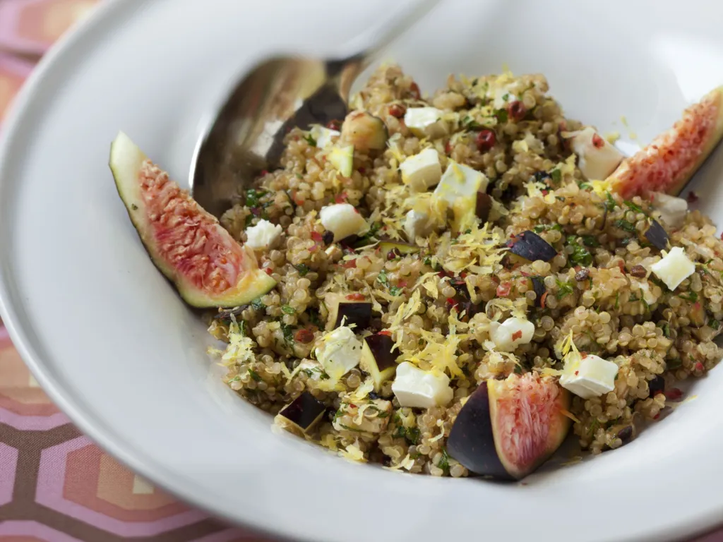 quinoa, figue, huile d'olive, vinaigre balsamique, poivre, sel, bûche de chèvre