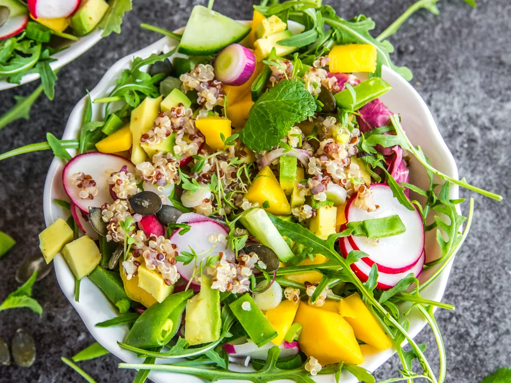 quinoa, citron, huile d'olive, graines de courge, sauce soja, roquette, mangue, avocat, radis, feuille de menthe
