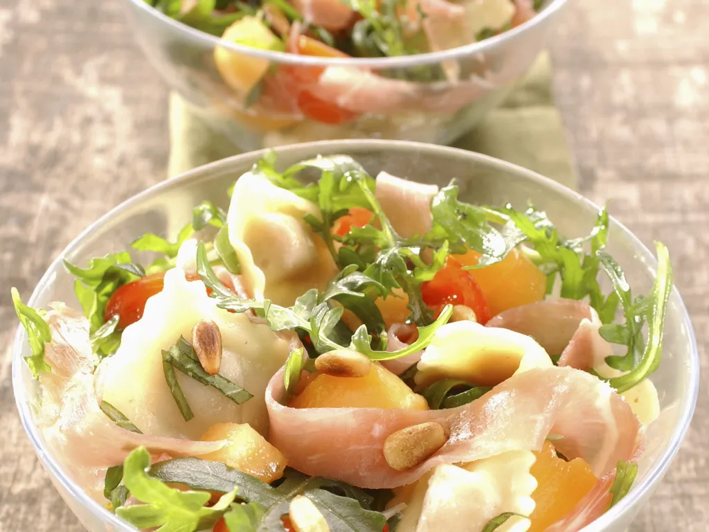tomates cerise, melon, pignons, huile d'olive, sel, basilic, roquette, raviole, jambon cru