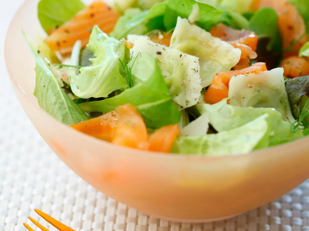 poivre, sel, parmesan, huile d'olive, vinaigre de vin, persil, salade, raviole, saumon fumé, échalote
