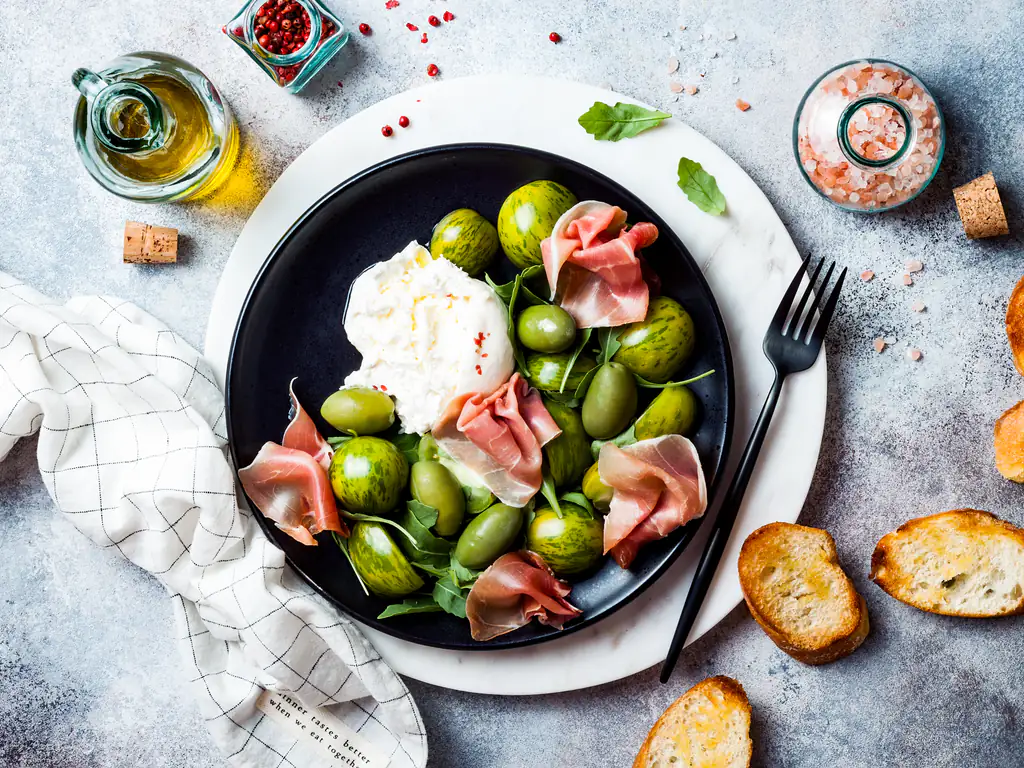 huile d'olive, thym, citron, poivre, sel, tomate verte, ail, burrata, roquette, jambon cru, olives vertes, pain