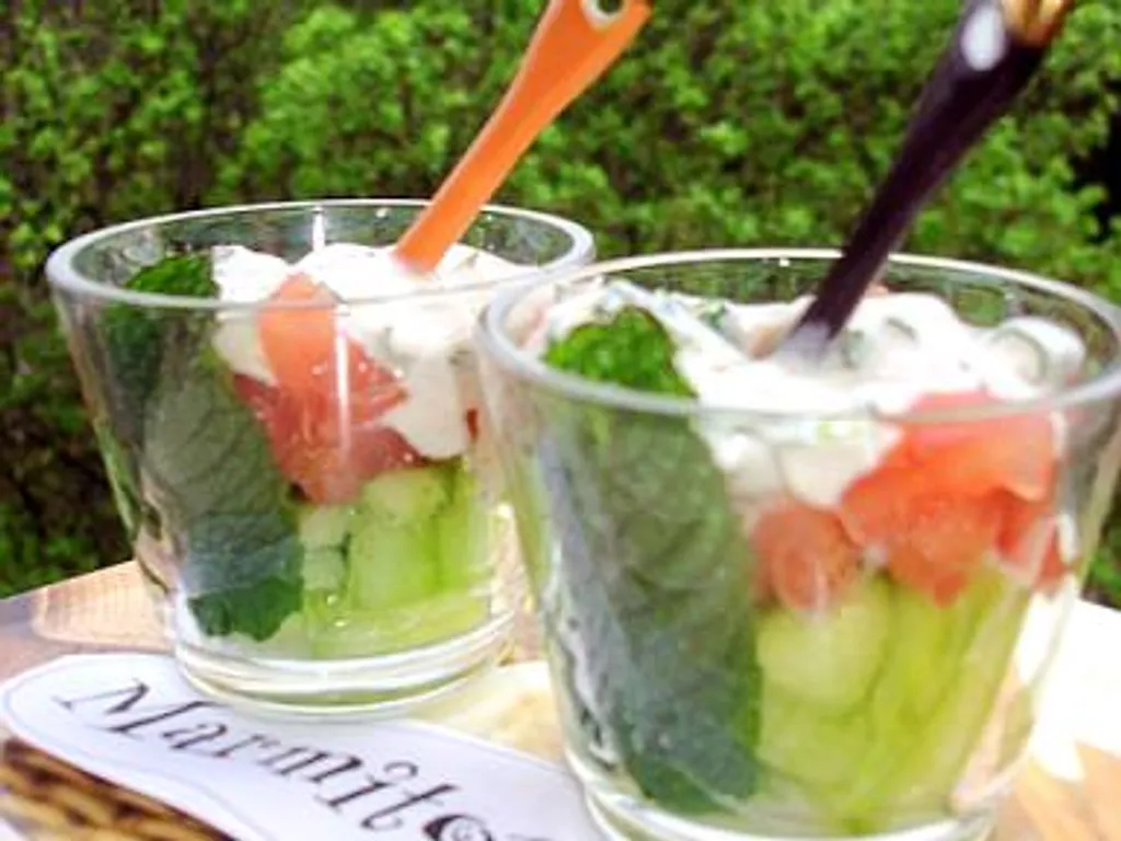 crème fraîche, jus de citron, poivre, sel, menthe, tomate, concombre