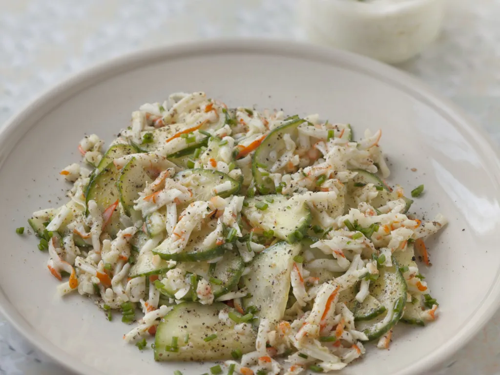 couper le surimi en tranches très fines (ça doit faire quasiment des miettes !) et l'ajouter au concombre.