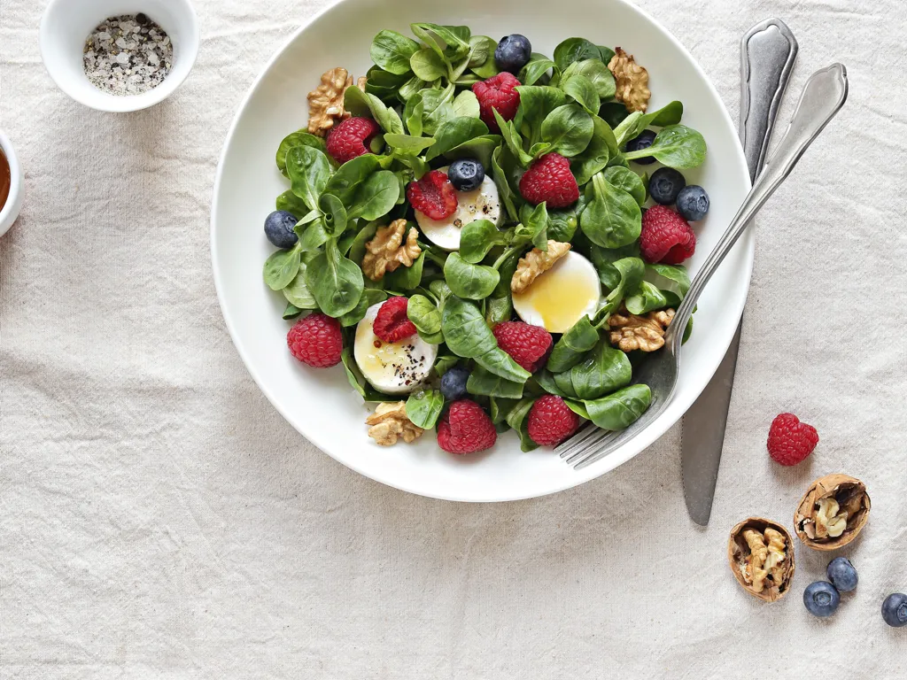 cerneau de noix, huile d'olive, miel, moutarde, vinaigre de cidre, sel, poivre, mâche, chèvre frais, framboises, myrtilles