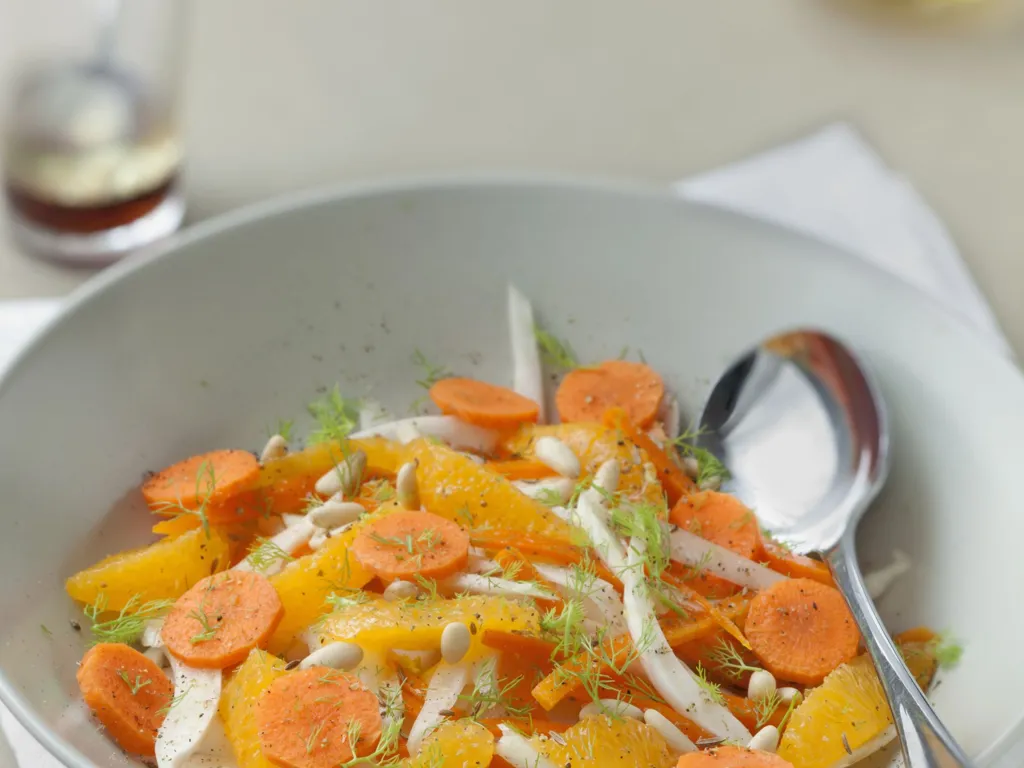 carotte, orange, pignons, cumin en poudre, poivre, sel, huile d'olive, vinaigre, fenouil