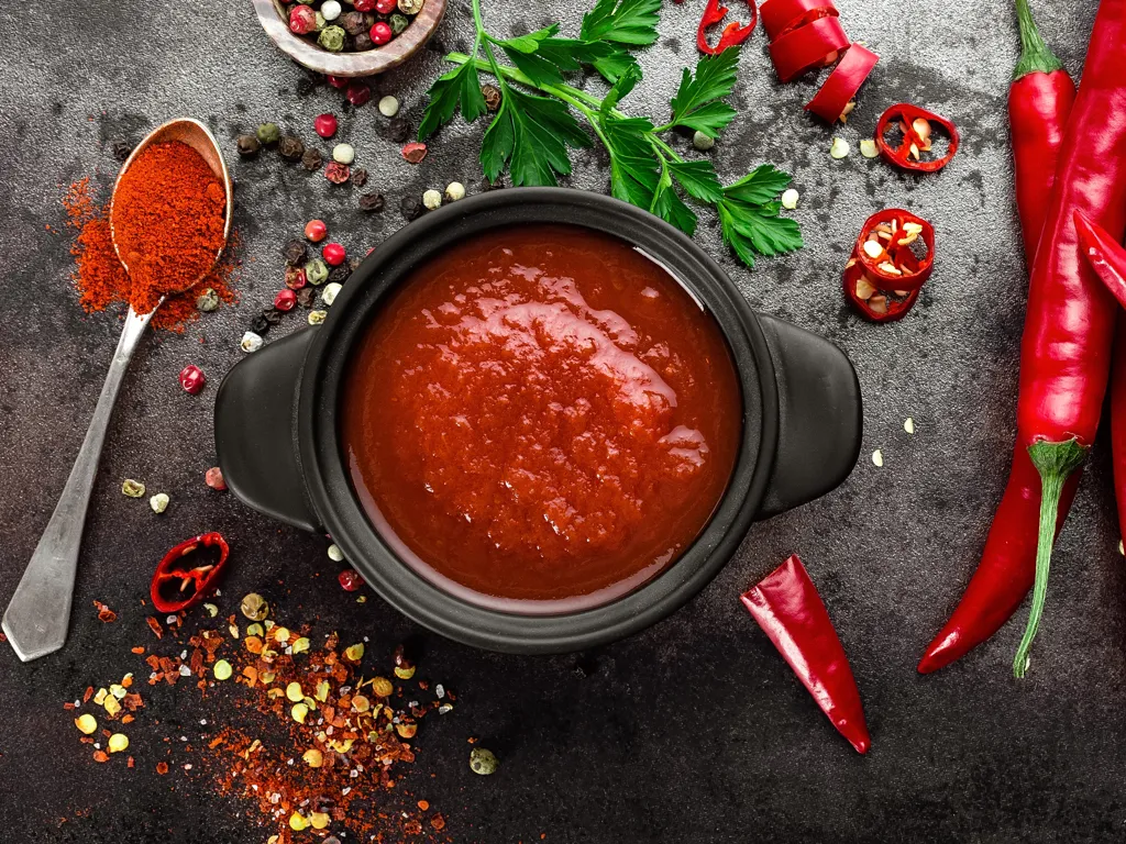 tomate, poivron rouge, poivron vert, oignon, ketchup, jus de citron, cumin, graines de coriandre, sauce sweet chili, sel et poivre