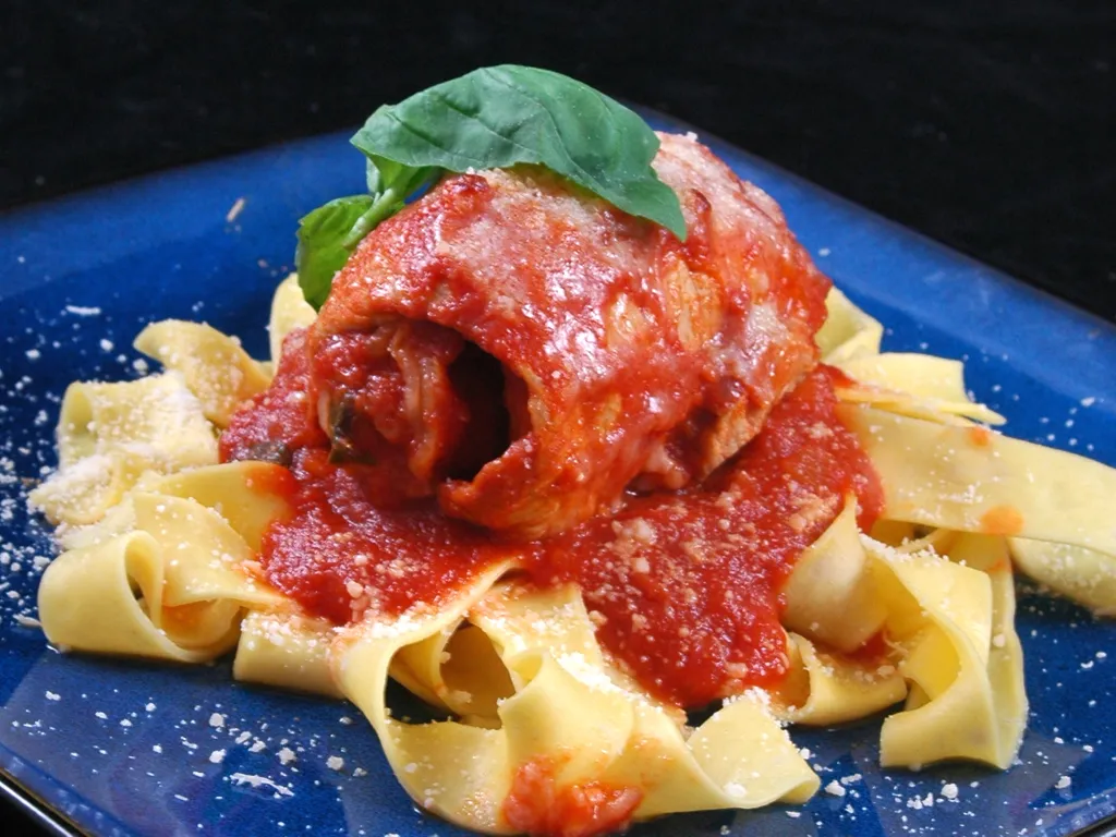 parmesan, escalope de veau, mozzarella, jambon de parme, coulis de tomate, basilic frais, échalote