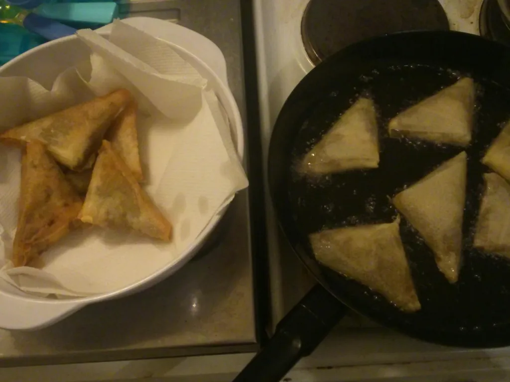 couper les feuilles de brick en deux parties égales, rabattre la partie arrondie pour former un long rectangle et déposer une bonne cuillère à soupe de votre mélange sur le bord droit ou gauche et rabattre pour former un triangle que vous terminer en glissant l'autre coté dans la base du triangle obtenu.