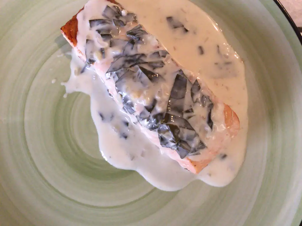 crème fraîche, vin blanc sec, huile, poivre, sel, saumon, oseille, fumet, échalote