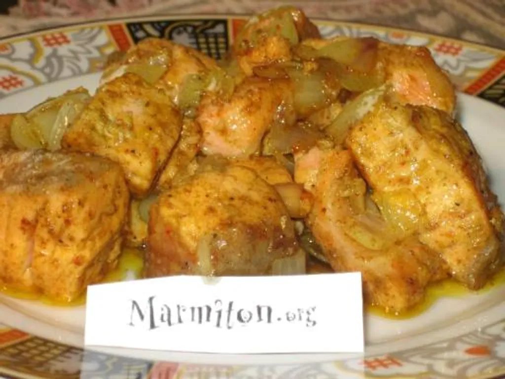 oignon jaune, ail, curry, cumin, paprika, piment, poivre, huile d'olive, saumon frais
