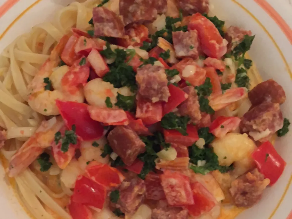 poivron rouge, ail, chorizo, vin blanc, huile, persil, scampi, crème liquide