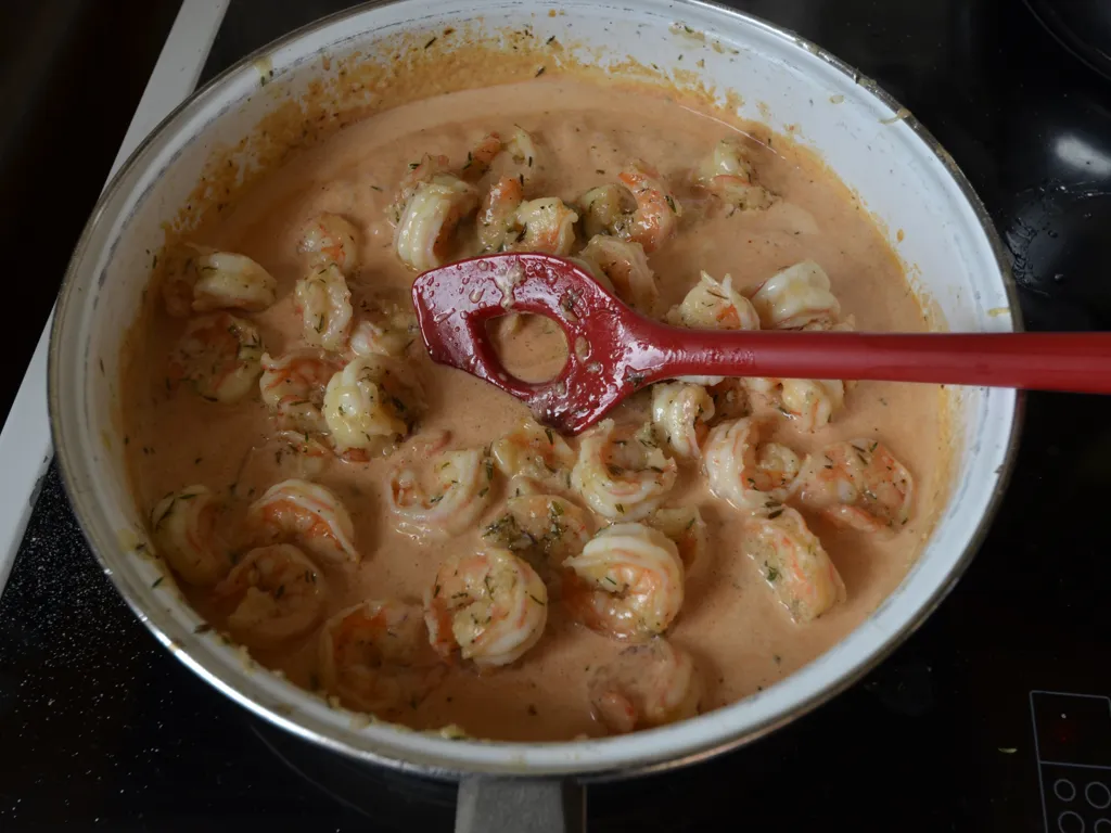 épaissir légèrement la sauce avec la fécule de maïs. ajouter les scampis à la sauce et réchauffer le tout pendant 2 minutes.