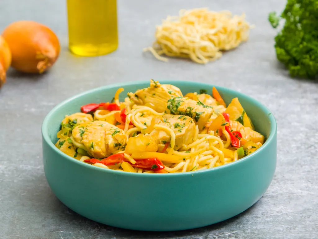 nuoc mam, sucre, nouilles chinoises, julienne, sauce soja, oignon, huile d'olive, persil, filet de poulet, sauce soja