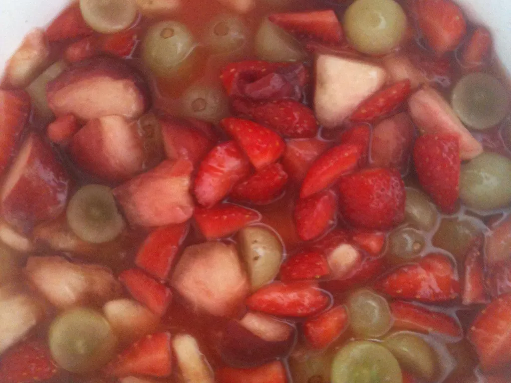 arroser de votre salade de fruits (salade de fruits plutôt exotiques : mangue, grenade, litchis, orange, kiwi, raisin, banane...) et mettre au frais pendant 2 h.