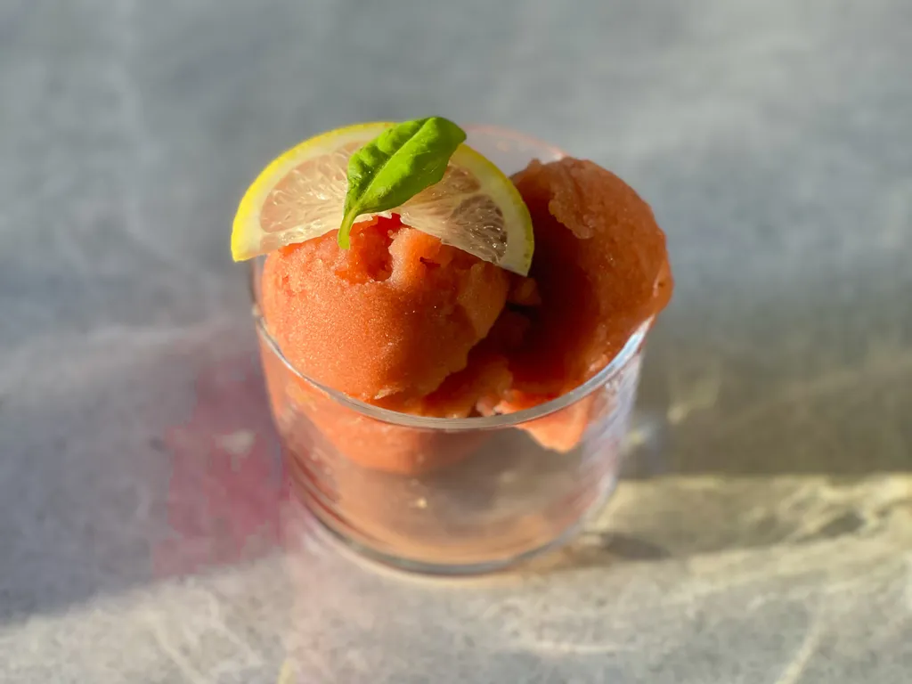 une fois les morceaux de pastèque congelés, les mettre dans un blender avec le jus citron/basilic puis mixer le tout. cette étape réalisée à l'aide d'un poussoir demande un peu de patience pour obtenir la texture parfaite ;-)