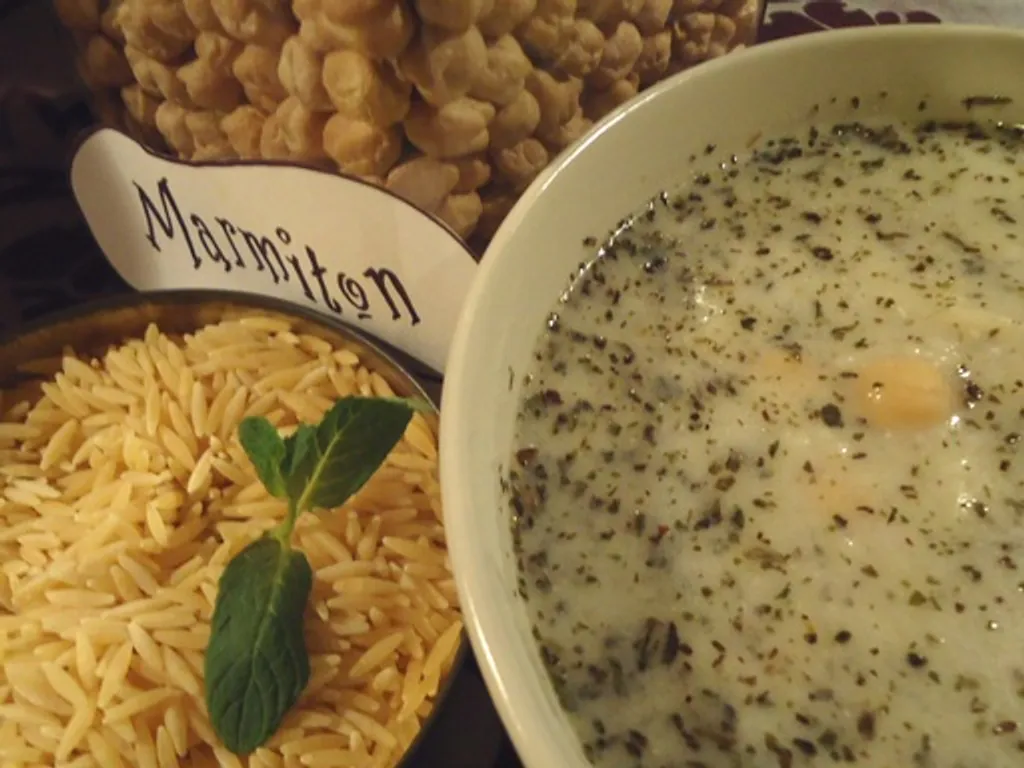 yaourt, pois chiches, pâtes, bouillon, farine, beurre, sel, menthe