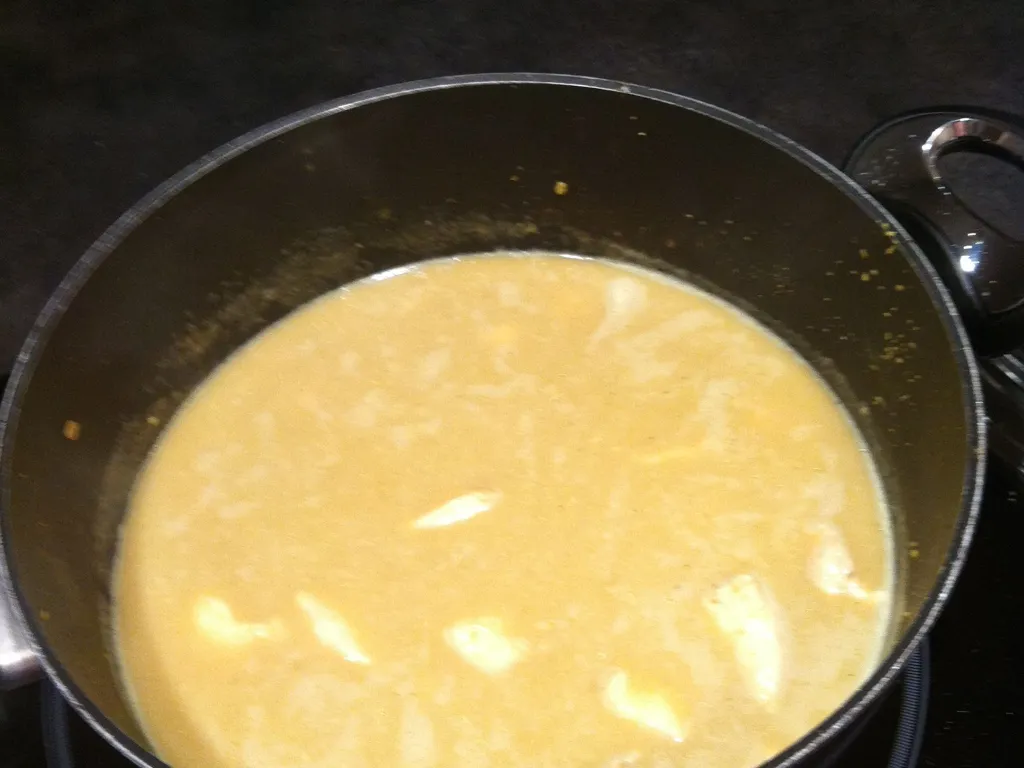 lentilles corail, carotte, oignon, ail, curcuma, gingembre, cumin, piment, coriandre, eau, blanc de poulet, lait de coco