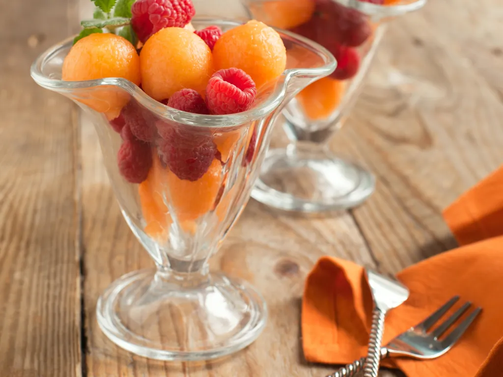 melon, sucre glace, framboises, menthe