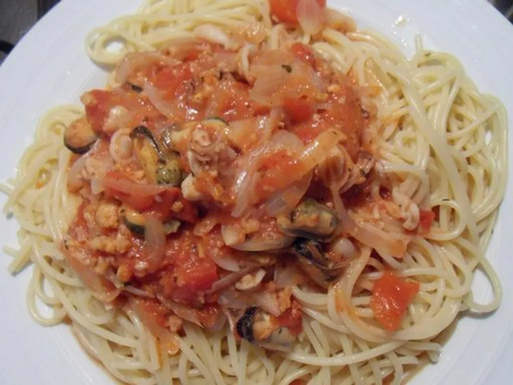 vin blanc, parmesan râpé, huile d'olive, piment d'espelette, basilic, spaghetti, fruit de mer, tomates pelées, échalote, sauce soja
