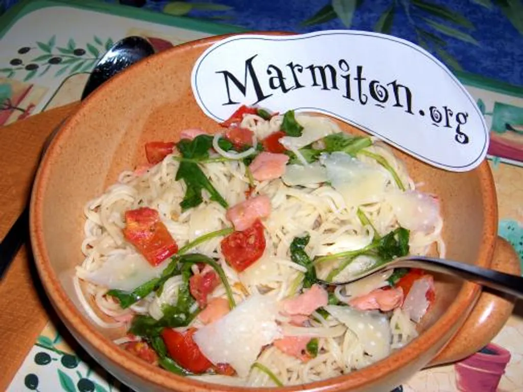 ajouter les lardons de saumon fumé, les morceaux de tomates confites et la roquette.
