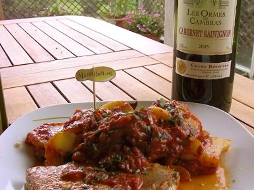 tomate, concentré de tomates, sucre, ail, thym, piment, vinaigre balsamique, pomme de terre, huile d'olive, poivre, sel, steak